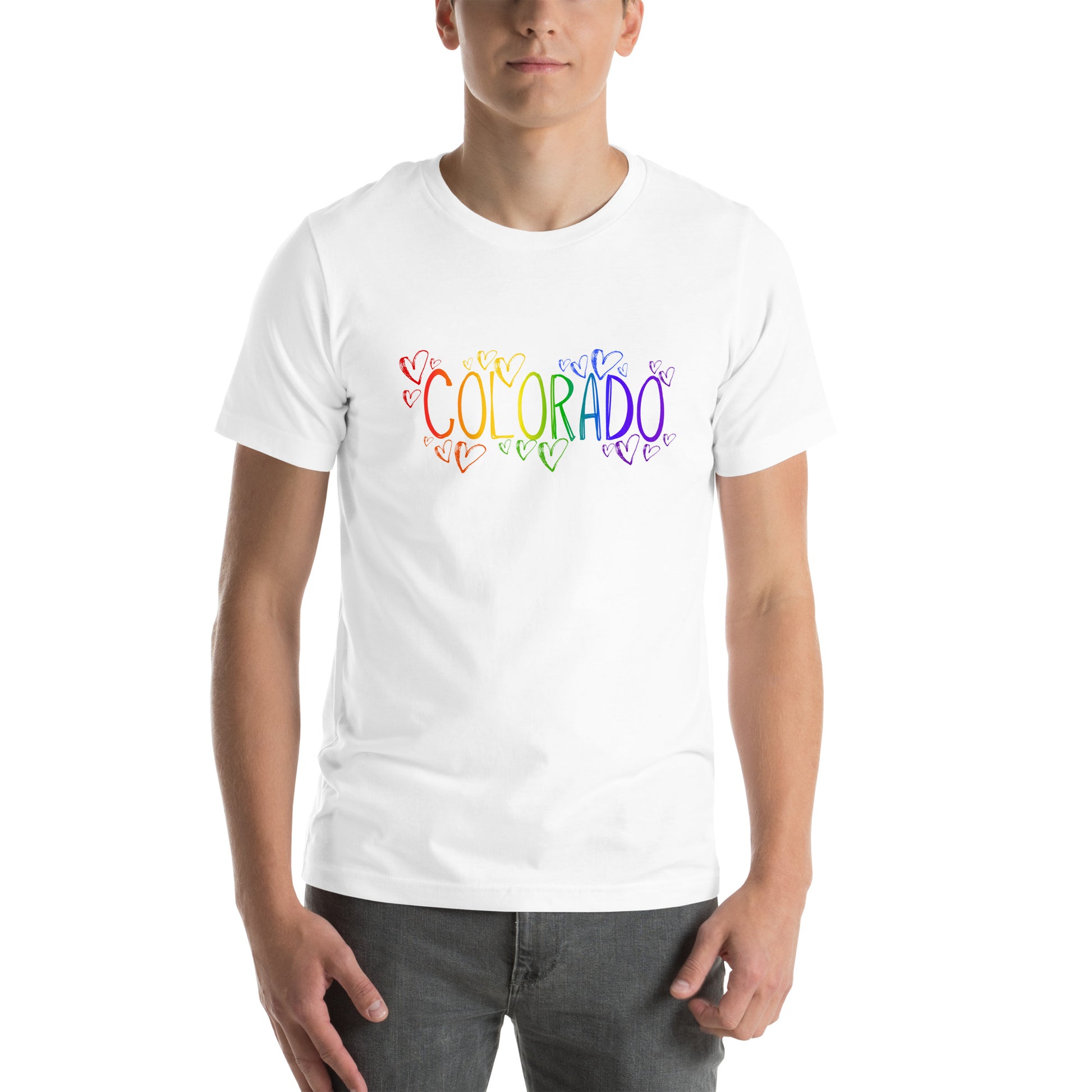 Step out with pride in our 'Colorado' crew neck t-shirt, where fashion meets a festival of colors. The design features elegant, thin letters filled with a gradient rainbow, sprinkled with tiny hearts to remind us that love is diverse and all-encompassing. This shirt is more than just apparel—it’s a statement of inclusivity and joy, representing the vibrant spirit of Denver's LGBTQ community. Perfect for Pride parades, casual outings, or as a heartfelt gift, it’s designed to spread love and positivity wherever you go.