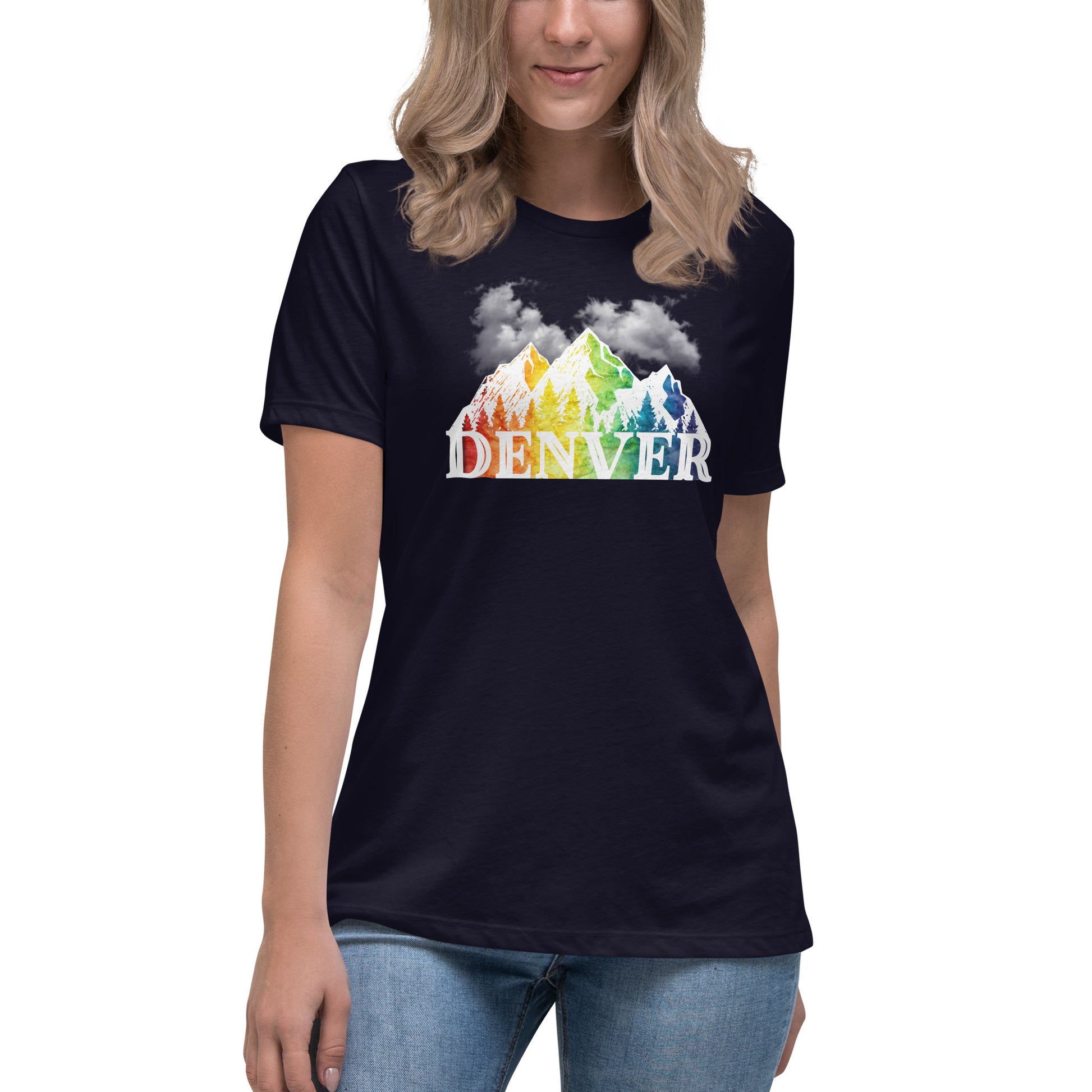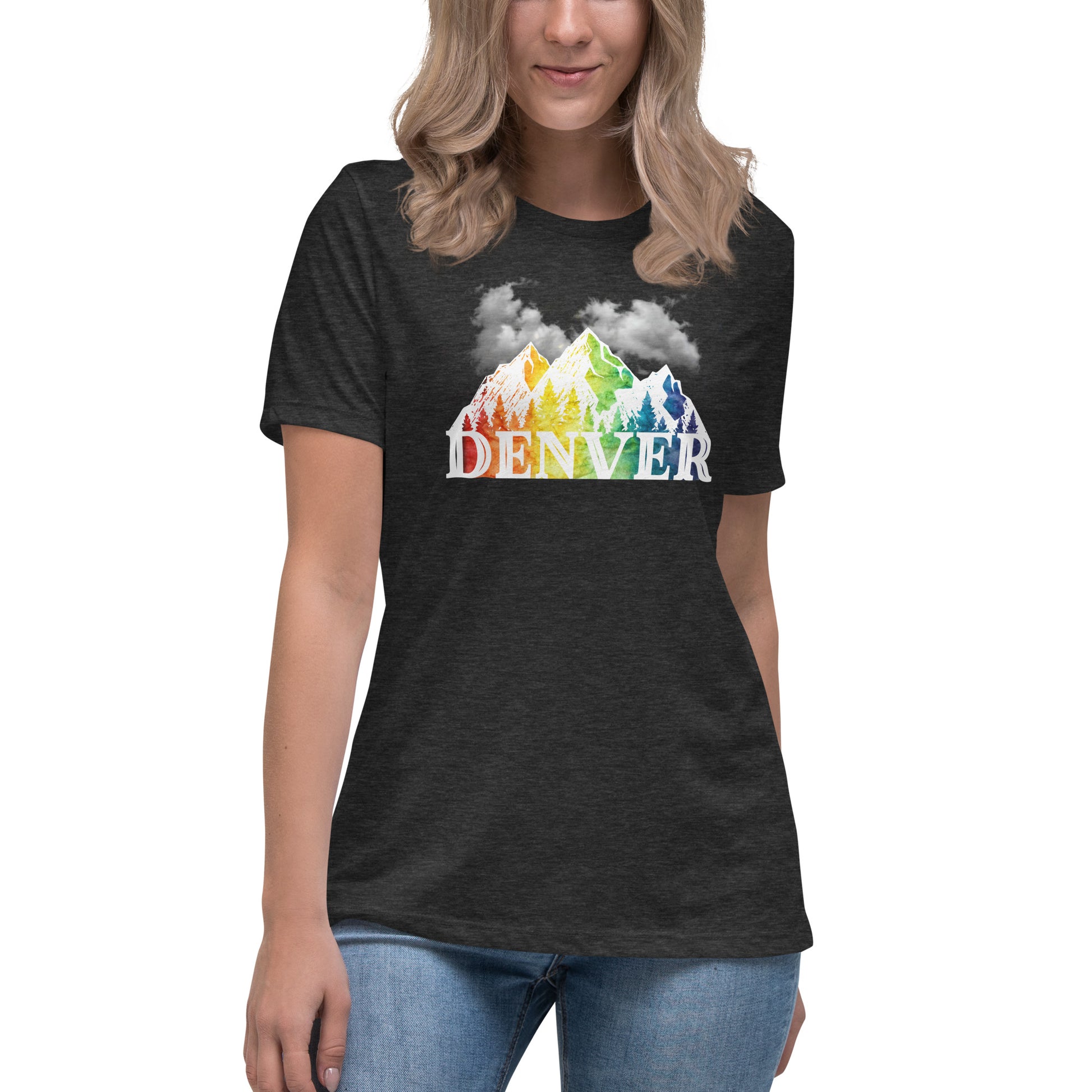 Experience the essence of Denver and the vibrant spirit of Pride with our Women's Short Sleeve Relaxed Fit Tee. The shirt features the word 'Denver' seamlessly blending into a picturesque mountain range under a canopy of clouds, all in gradient rainbow colors. This design symbolizes the blend of urban life and natural beauty, paired with the diversity of the LGBTQ community. Whether you're marching in the Pride parade, exploring the Rockies, or enjoying a casual day in the city, this tee is designed to offer comfort and make a statement. Embrace your identity and show off your Denver pride with a top that's as versatile as it is visually striking.